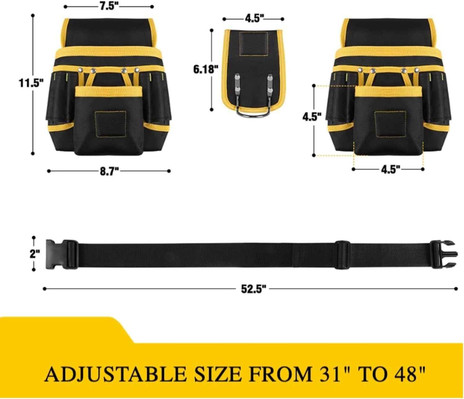 - 【ADJUSTABLE LENGTH】The tool belt is adjustable in length to fit a waist size of 31 inches - 48 inches. 3 separate pockets can be freely removed according to the number of tools you have.
