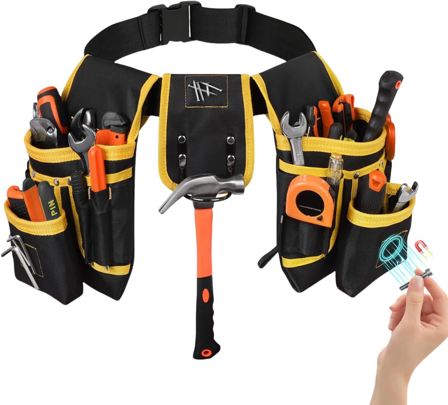 - 【SAFETY MAGNET ATTACHMENT】The top of the hammer holder and the front of both pouches are equipped with magnets. Ensure a firm grip on magnetic items such as nails and screws. Never worry about losing small essentials again.