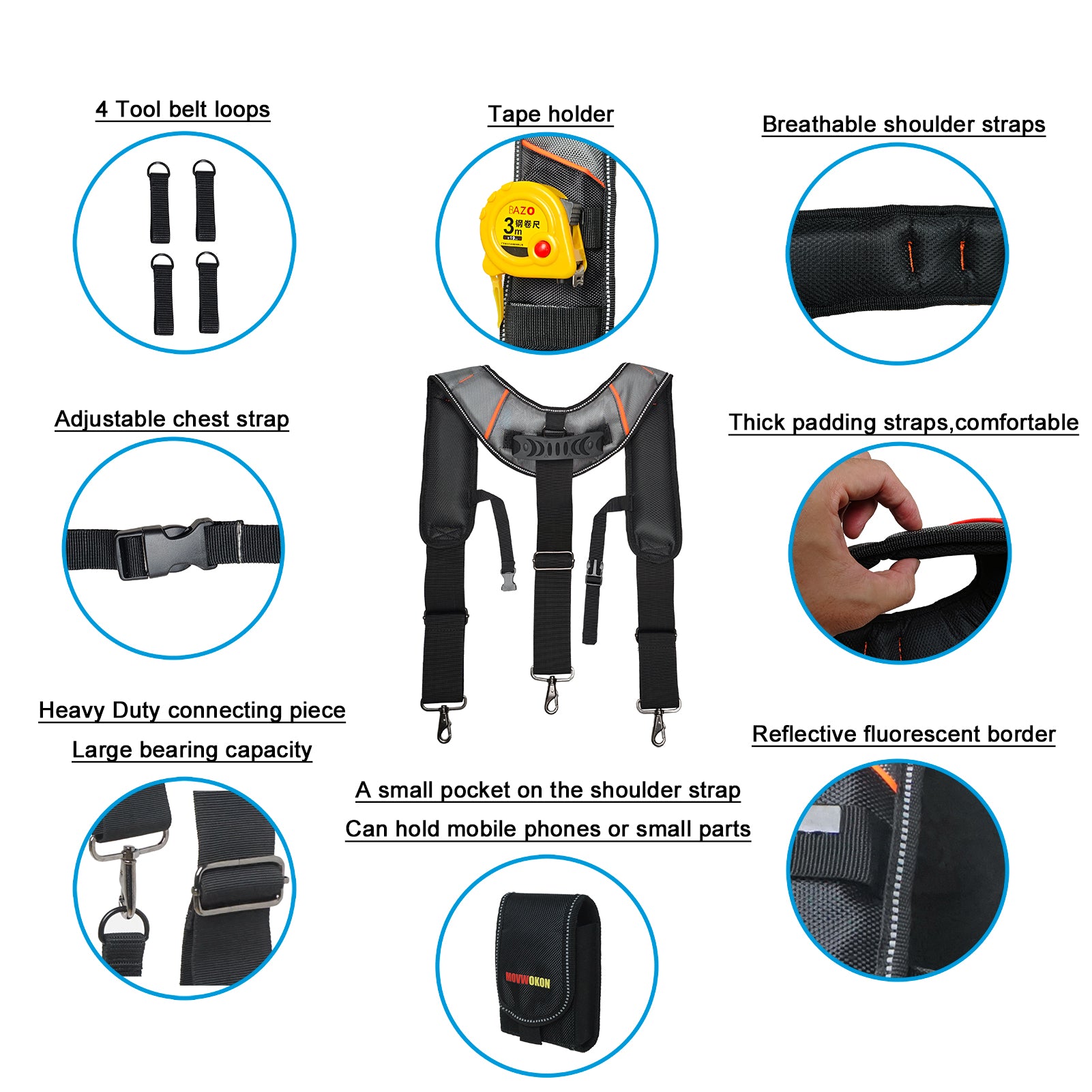 - Durable : tool belt suspenders is made of high-density fabric, precision stitching and sturdy metal hooks, and thick padding to ensure your long-term use.